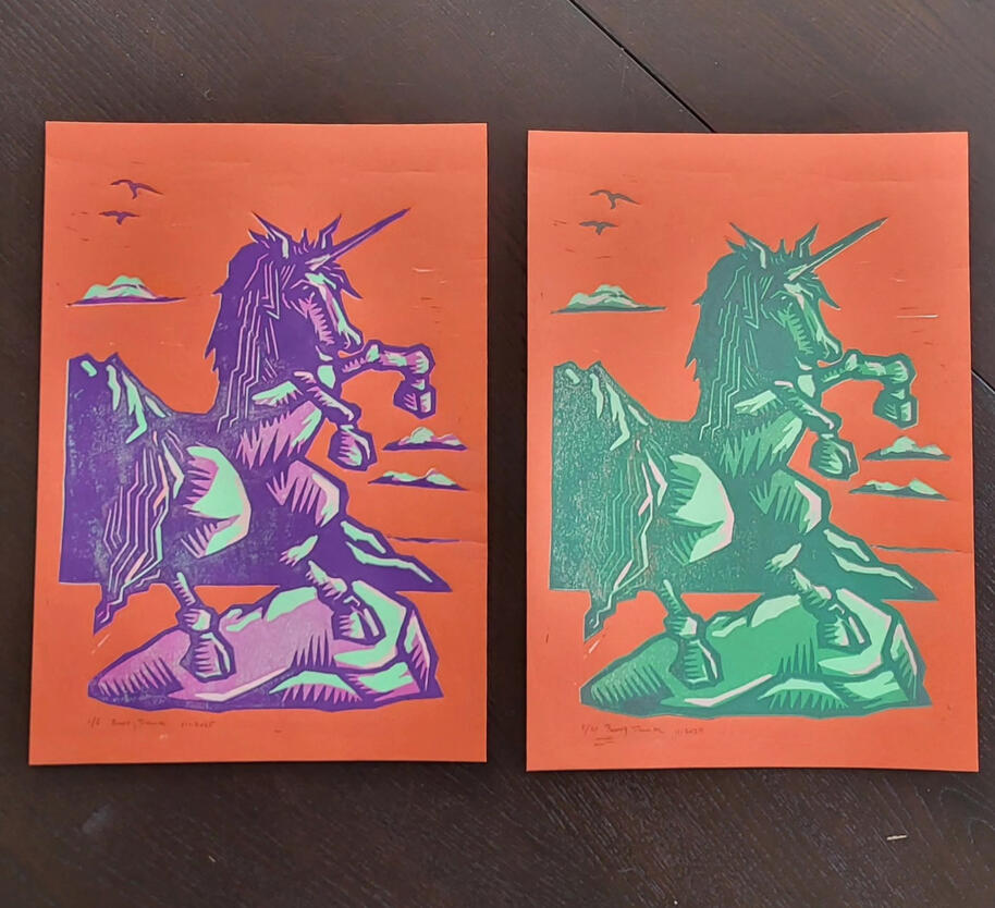 I was asked to create a unicorn illustration for two sisters. While printing, I decided to make two different colour versions so each sister could have her own unique print.Printed on a warm red/orange 180gsm A4 paper, using 4 colour layers carved from one single linoblock.Great project and I made a few extra prints available too!