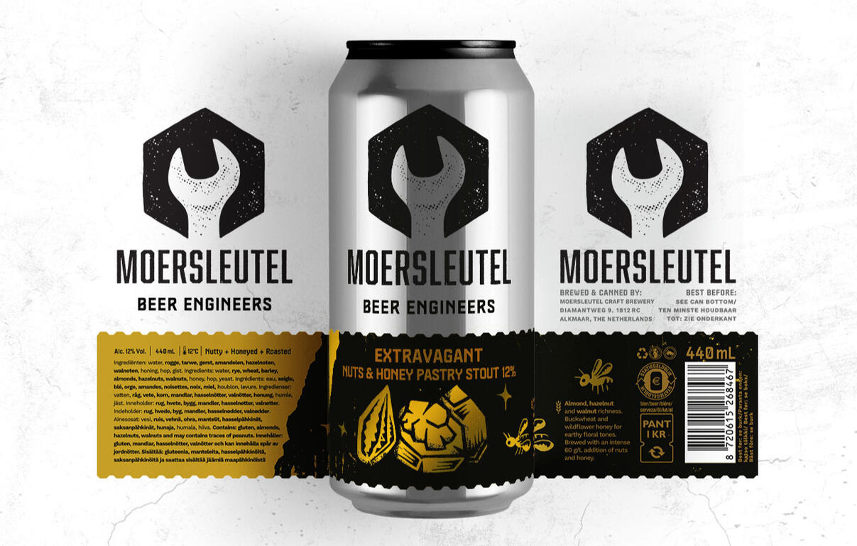 Being a graphic designer for a brewery allows creative production processes like linocut printing to thrive. In 2026, Moersleutel reduced label sizes to strengthen brand recognition, introducing a minimalist illustration style using bold black shapes and metallic gold accents, enhancing a luxurious feel—reflected both in print and in this Extravagant pastry stout