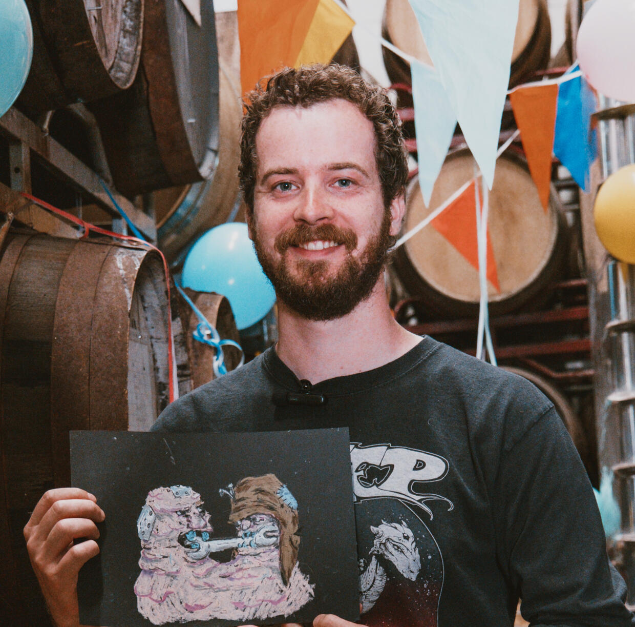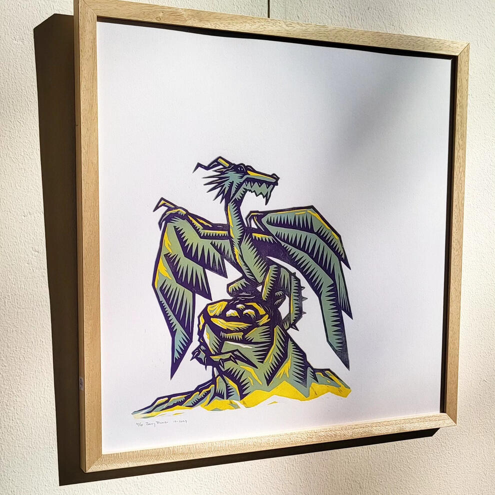 Barry Timmer (b. 1993) is a multidisciplinary graphic designer, illustrator, and printmaker, best known for his bold linocuts and vibrant visual style. Drawing inspiration from a wide range of influences—including (dark) fantasy, nature, folklore, mythological language, and the vivid color palettes of 1980s comics—his work blends raw craftsmanship with a rich narrative world.Barry’s artistic voice is shaped by the tactile energy of handmade processes and unrefined materials. He primarily works with linocut, chalk, and monoprint, mediums that embrace imperfection and chance—an intentional contrast to the polished, predictable aesthetics of today’s digital age. His work explores rawness in a society increasingly obsessed with smoothness and simplification.While he works primarily in-house for Moersleutel Craft Brewery, Barry also collaborates with a variety of clients including: Jumbo Monique Supermarkt, Funk Gilde, Noordhollands Dagblad, Kunstuitleen Alkmaar, Filmhuis Alkmaar, Beef Chief, Oedipus Brewing, Hopster Magazine, and various local startups.Education: